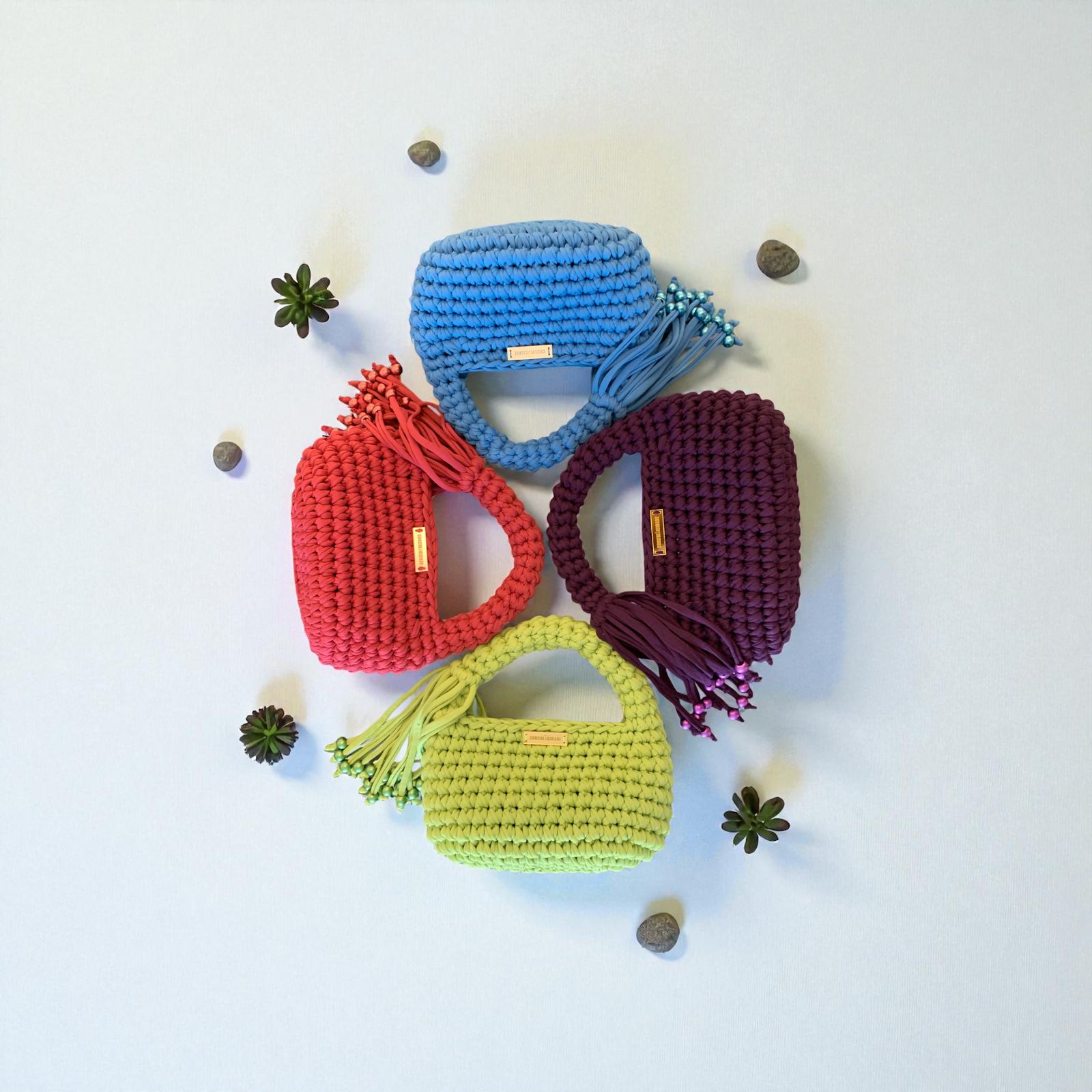 Bolsa Mini Bag, confeccionada com fio de malha premium, com fecho interno de botão imantado, e franjas com miçangas na lateral.